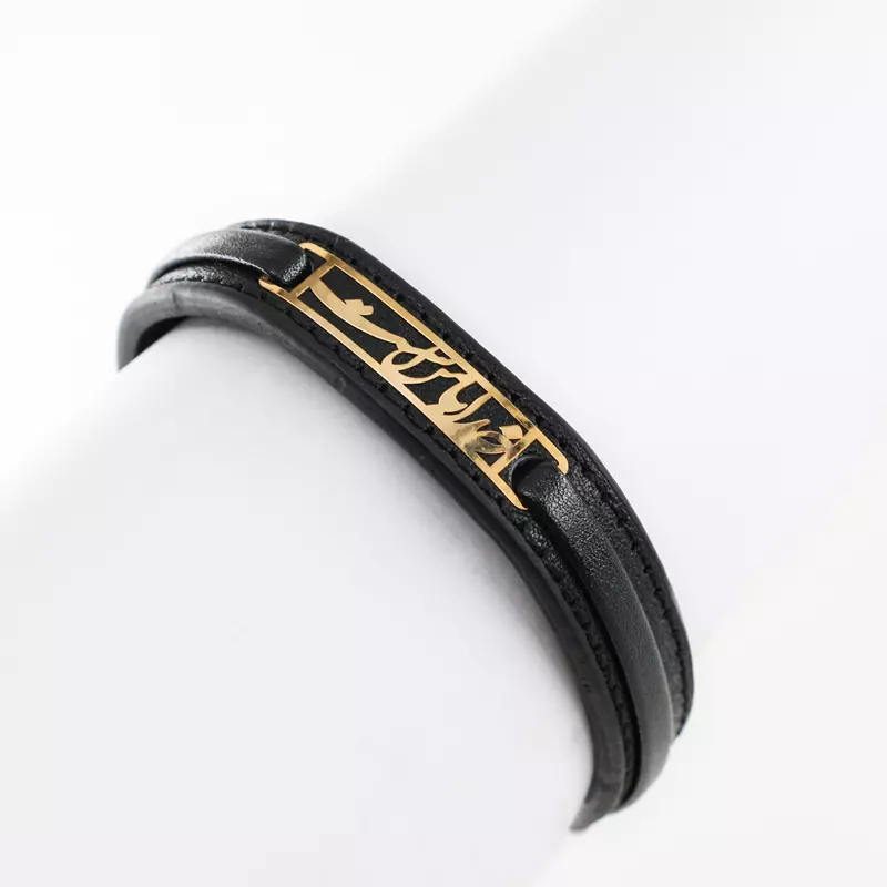 دستبند چرم طلا نیوکالکشن همراه با پلاک لیزری (خدا با من است)